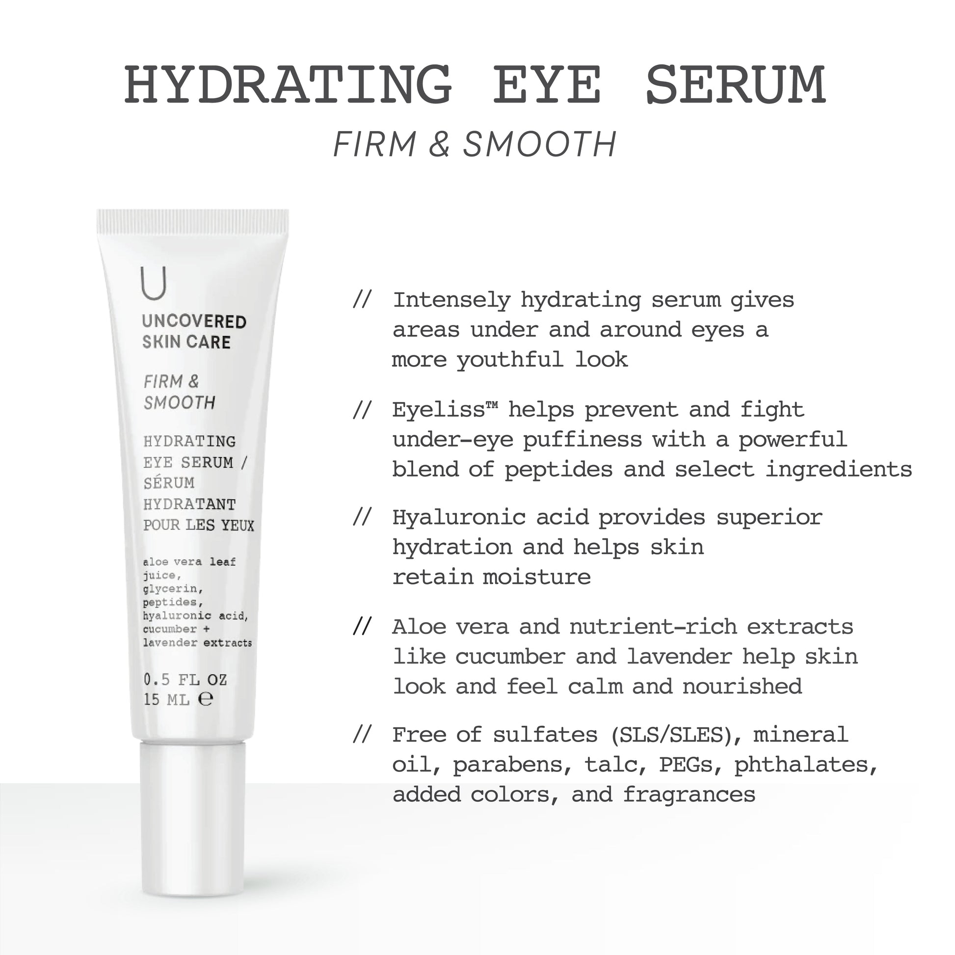 Fight the visible signs of aging with a cocktail of moisturizing, beneficial ingredients. This serum helps skin under and around your eyes appear smoother, firmer, and more youthful by replacing lost moisture and fighting dark circles and puffiness. Powered by hyaluronic acid and the Eyeliss™ peptide complex, this serum helps retain moisture, softens the appearance of eye-area fine lines and wrinkles, and renews the skin’s surface over time. Morning and night, simply pat under and around eyes using your ring fingers for the gentlest application.