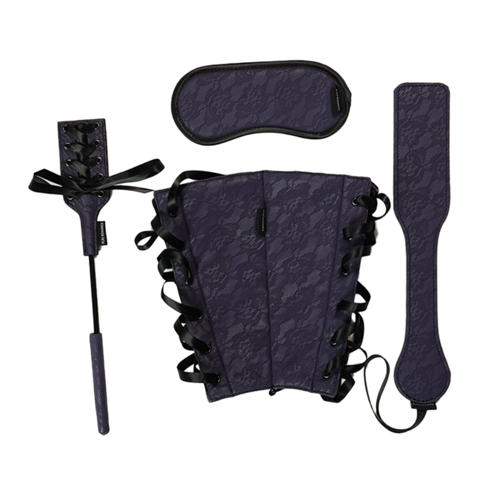 Delve into a whole new world with a luxe, four-part set featuring a blindfold, paddle, crop, and arm restraints. The paddle and crop take painful pleasure experiments to mastery, the blindfold removes sight to spotlight sensation, and the arm restraints bind for sultry submission. Satin accents and plush, lace-print material add a touch of softness to contrast the bold intensity of play. Try each accessory one by one and make it a slow descent into all things erotic, or pair off parts of the set for multi-faceted satisfaction that exceeds expectations time and time again!